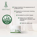 Brighten & Even Skin Tone: Greenika Underarm Whitening Cream helps remove excess melanin, unclog pores, and eliminate dirt buildup, revealing a smoother, more radiant underarm area.