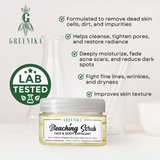 Powerful Exfoliant to Detoxify the Skin: Greenika Face & Body Whitening Bleaching Scrub effectively removes dead skin cells, cleanses, minimizes, and tightens pores to restore radiance to tired, dull skin. Infused with organic ingredients, this scrub provides powerful exfoliation and deep cleansing, revealing a more luminous complexion.