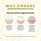 Ultra Whitening, Exfoliating, and Anti-Aging: Greenika Glutathione Toner gently removes dead skin cells, excess oil, dirt, and other impurities—revealing a fairer, brighter, and smoother complexion. It’s a daily essential for those aiming for visibly clearer and more even-toned skin.